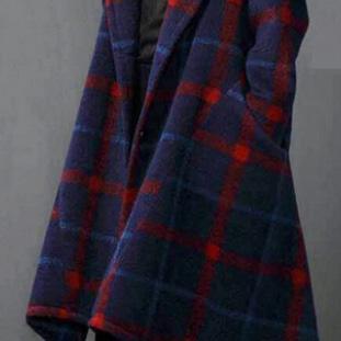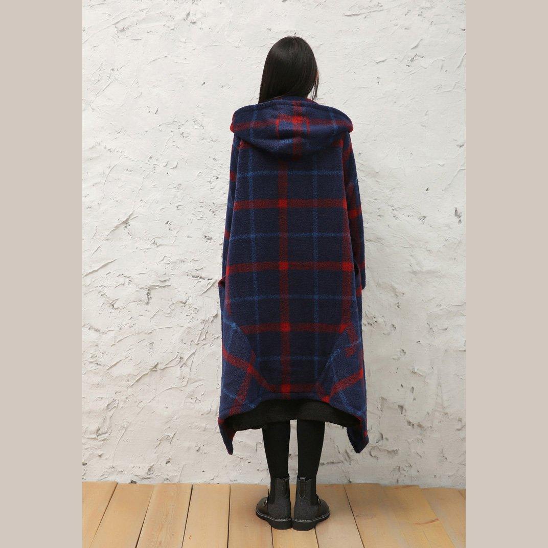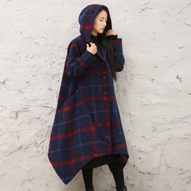 vintage blue Plaid Woolen Coats plus size long coats asymmetric woolen hooded outwear